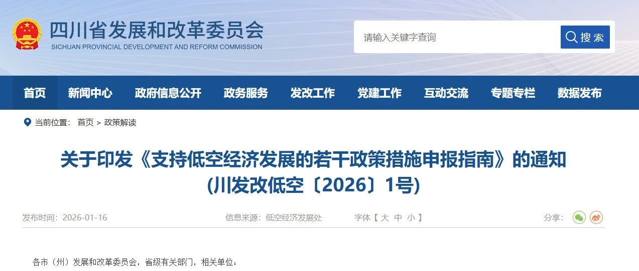 重要通知|关于印发《支持低空经济发展的若干政策措施申报指南》的通知(川发改低空〔2026〕1号) 成都市无人机产业协会 · 1 周前 |