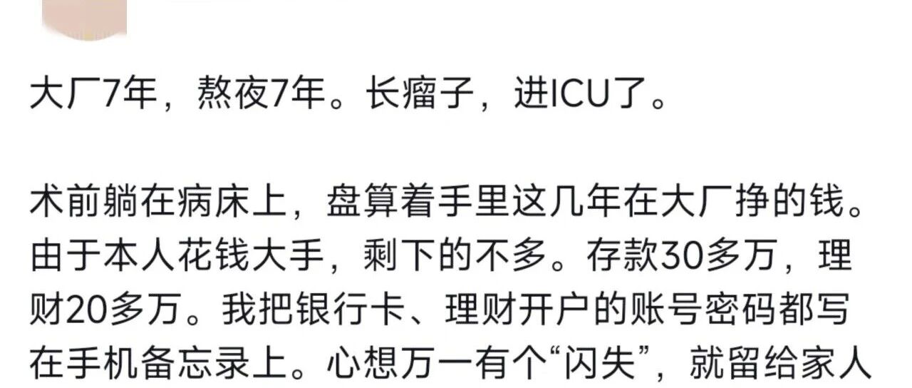 某网友:大厂工作7年,熬夜7年,终于“熬”进了ICU。身体长了个瘤子 蚂蚁大喇叭 · 21 小时前 |