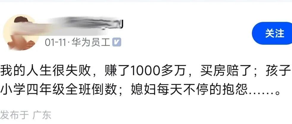 华为员工:我的人生很失败。赚了1000多万,买房赔了;孩子成绩全班倒数;媳妇整天抱怨 蚂蚁大喇叭 · 4 天前 |